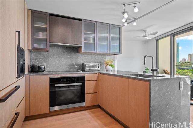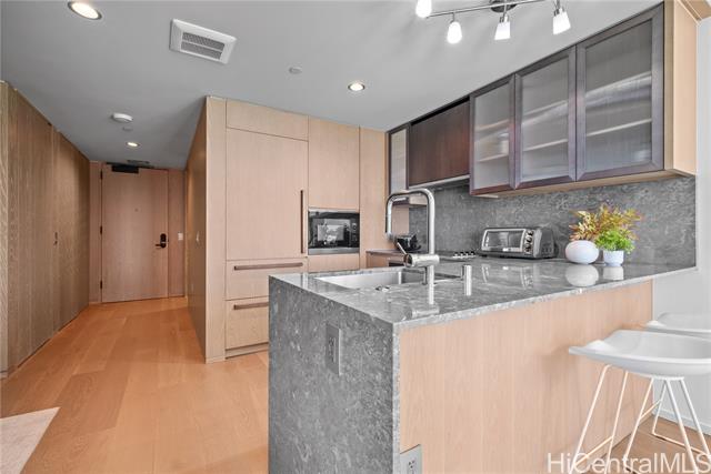 koula at ward village offers island living at its best! relax and enjoy ocean and pool views with cool breezes from the comfortable lanai. a popular floorplan with bonus nook for remote work or dining, this 1-bedroom, 1-bath diamond head facing unit includes a well-appointed kitchen with premium miele appliances, natural stone counter tops, engineered wood flooring, and an assigned, covered parking space. koula living includes access to resort-style amenities that include bbq pavilions, speed grills, private & pool side cabanas, indoor & outdoor fitness centers, locker rooms with steam showers & sauna, private treatment room, private dining room, grand lanai, great lawn, play area, pool, whirlpools, and guest suites. conveniently located in the heart of kakaako near shopping, dining, ala moana beach, whole foods and more! -