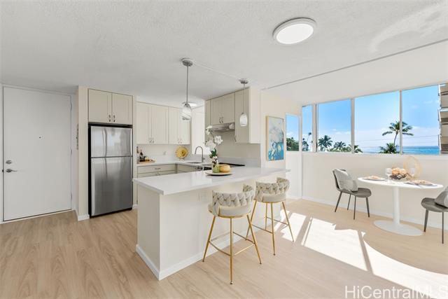 "rarely available offering w/surreal coastal views! welcome to 3056 kalakaua – a distinctive and timeless boutique building along honolulu's cherished gold coast, offering an intimate private lifestyle with only 2 residences per floor and a warm, pet-welcoming community vibe. step into this sparkling newly remodeled (2025) 2-bed, 2-bath home and immediately become captivated by larger-than-life peaceful ocean views, rolling surf, and bright blue skies. wake up to stunning diamond head views and fall asleep to the sound of the ocean just beyond your windows! designed for effortless island living featuring modern finishes, wrap around covered lanais, in-unit laundry, private trash chute, extra storage and assigned parking stall. right outside your door, experience the very best of hawaii living — swim at dawn, surf at tonggs, enjoy a sunset at diamond head, dine along waikiki's world-class restaurants, catch a concert at the waikiki shell, or unwind at the elks or outrigger canoe club. this is the true gold coast lifestyle — unique, iconic and truly special. every day feels like a getaway!" -