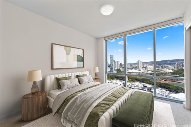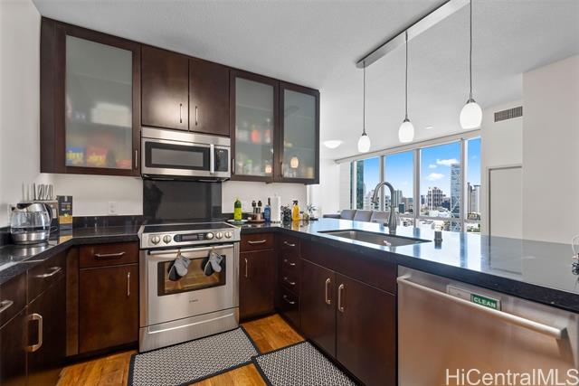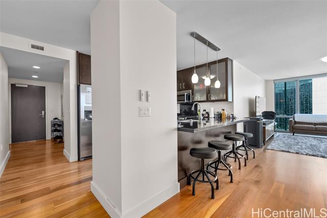 welcome to waihonua #2409! ideally situated between ala moana and ward village, this residence offers the perfect blend of luxury and convenience at an attractive price. the spacious floor plan showcases ceiling to floor windows offering breathtaking city and mountain views. unit features include: central a/c, engineered wood flooring, granite countertops, stainless steel appliances, & two prime covered parking stalls along with an overhead storage. resort like amenities include: 24 hour security, guest parking, infinity pool, jacuzzi, fitness center, theater room, guest suites, and pet friendly as well. -