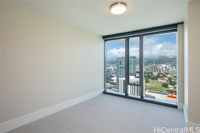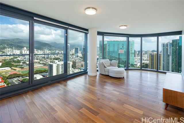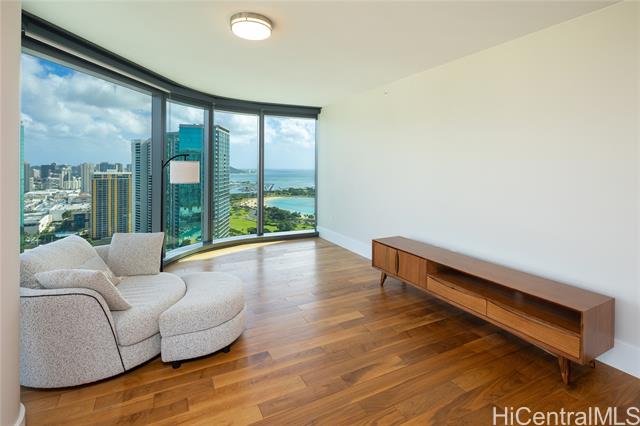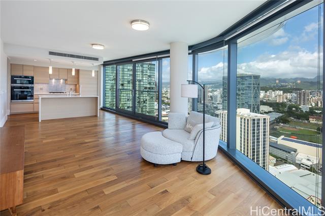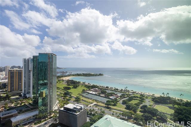 fall in love with this luxurious, much preferred, corner unit boasting panoramic views of the beach, ocean and mountains. floor-to-ceiling glass wraps around the living area, offering breathtaking vistas and inviting cool breezes. high ceilings and wide sliding doors create a bright and airy atmosphere. the gourmet kitchen features top-of-the-line miele appliances, including a gas stovetop and a wine refrigerator, perfect for the discerning chef. high-quality finishes abound, with quartz countertops, hardwood floors, newer carpet in the bedroom and recently painted throughout. this private corner unit offers ample storage, including a walk-in closet. unwind in the world-class amenities, including a stunning cantilevered glass bottom pool, a hot tub, a private theater, a tennis court, a fitness center, multiple entertainment areas with chef's kitchens and much more. beyond the building, enjoy the vibrant ward village community with its shops, restaurants, and being right next door to whole foods market. ala moana beach park is across the street, offering endless opportunities for outdoor activities. a must see for anyone looking to purchase a luxury one-bedroom in ward village. -