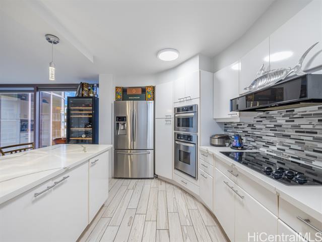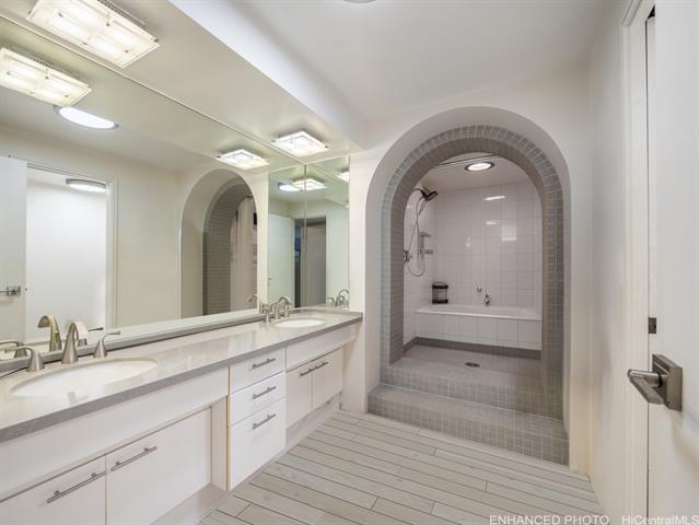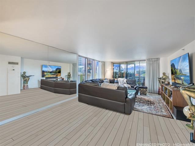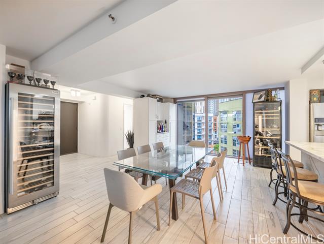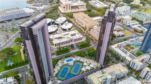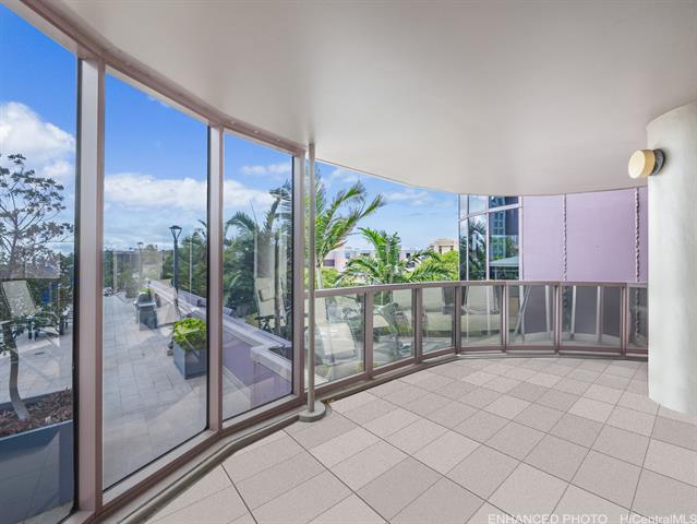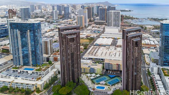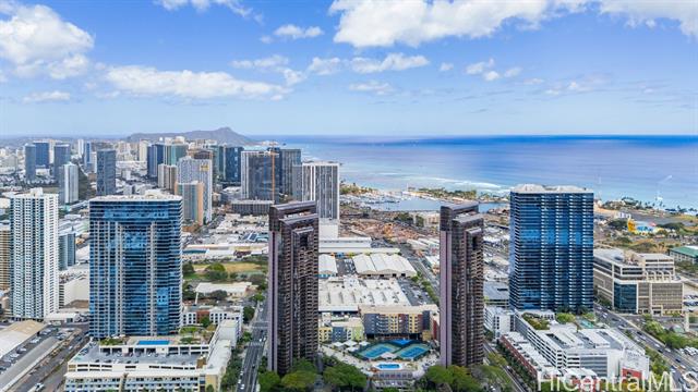 experience the best of urban island living in this spacious 2-bedroom, 2-bath, 2-parking unit located in the heart of kaka'ako- hawaii's most dynamic and vibrant neighborhood. this low-floor corner unit features a generous lanai with tranquil tree-top and ocean views, perfect for relaxing or entertaining. inside, the unit boasts a sleek, glossy ceiling and large living room mirrors that enhance light and space with wall to wall porcelain plank tile flooring. the recently renovated kitchen is both modern and functional, showcasing wide quartz countertops and island, ample cabinetry and drawers, newer appliances, and a built-in bar. comfort is ensured with a rebuilt a/c system and new thermostat. the primary suite includes walk-in closet and an ensuite bathroom with updated shower tile. floor-to-ceiling windows and sliding doors complete with new drapes and blinds fill the living and dining areas with natural light, creating a bright, townhouse-like atmosphere with the security and convenience of condo living. enjoy access to impressive amenities including two fire pits, party cabanas, and more. ideally situated near salt, downtown, aloha tower, hospitals, beaches, & restaurants. -