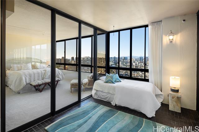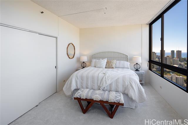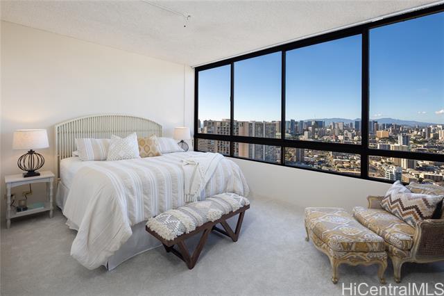 now is your chance to own this one-of-a-kind, ph unit in iolani court plaza! this unique and spacious 38th floor, 1081sf 1bedroom/1 bath unit comes with two full-size, side-by-side parking stalls. the ph floors have high 9' ceilings, and a gorgeous glass line spans the entire length of this unit to offer beautiful mountain-to-ocean views. a 163sf enclosed glass den can be used as a second bedroom, office or craft studio - or, perhaps open up the space to enlarge the entire unit. upgrades include brand new carpet, new stainless steel kitchen appliances, and fresh paint throughout. central ac keeps the unit nice and cool, and electricity is included with the fee. the building has sprinklers to comply with fire safety regulations. iolani court plaza features a variety of amenities - pool, jacuzzi, bbq grills, recreation room, grassy lounge area, tennis courts, pickleball court and a putting green. the building is conveniently located near restaurants and shopping at moiliili, mccully and uh manoa. it is also near the freeway on and off ramps, and by iolani school. -
