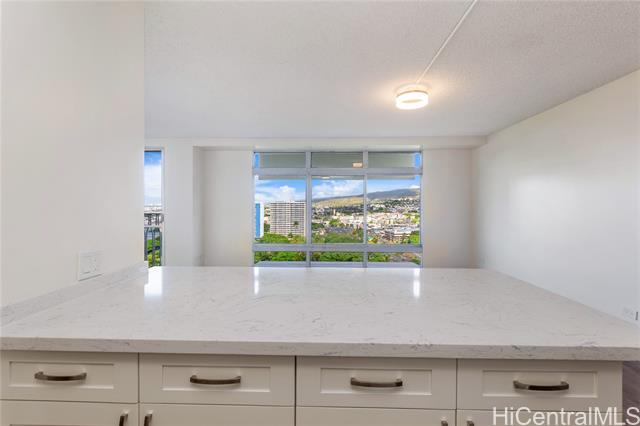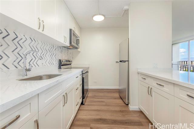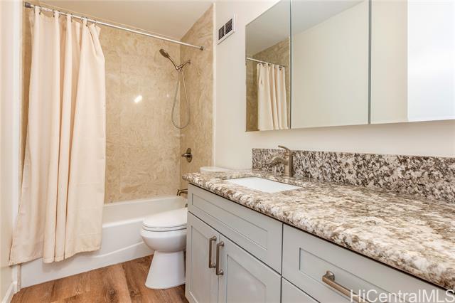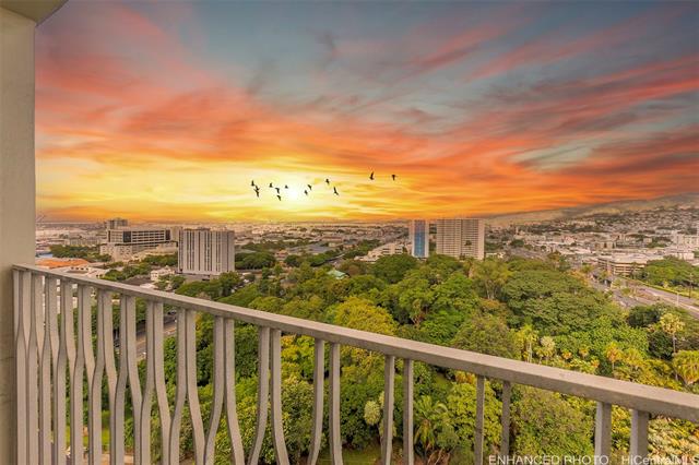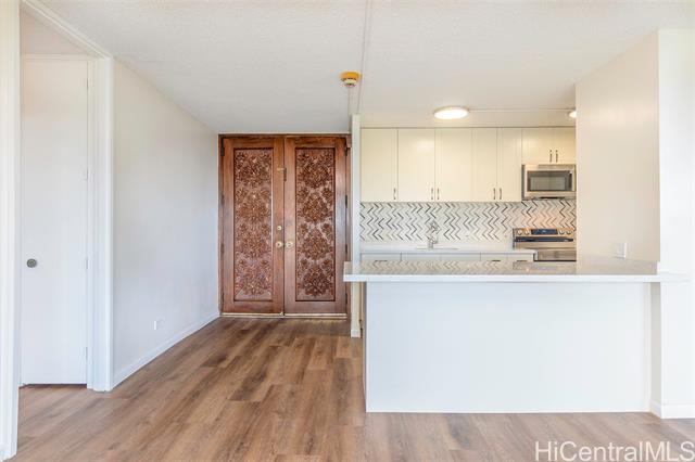 "don't miss this rarely available corner end unit in the queen tower at queen emma gardens. this spacious 2 bedroom, 1 bathroom home with 1 covered parking stall has been beautifully renovated with a modern kitchen featuring stainless steel appliances, quartz countertops, new cabinets, and a stylish backsplash. laminate wood flooring flows throughout the unit, adding a clean and contemporary feel. adding to its unique appeal, this was historically the one-of-a-kind unit where the original developer and resident manager resided, featuring ornate double doors that set it apart. take in the beautiful 20th floor city and mountain views overlooking foster botanical gardens. queen emma gardens is a pet-friendly community offering wonderful amenities, including japanese-style tea-houses, swimming and wading pools, a tranquil koi pond, bbq area, and picnic sites, all in a convenient location near downtown honolulu, shopping, and dining. put this on your must-see list! one or more photos have been enhanced." -