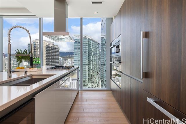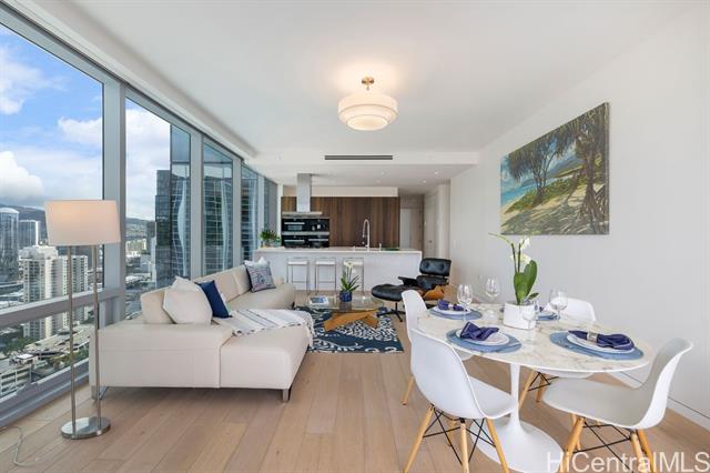 waiea redefines modern luxury in hawaii, located front row along ala moana boulevard as the crown jewel of honolulu's skyline. its striking glass facade and thoughtfully designed interiors create a residence of unmatched sophistication, offering sweeping views and architectural elegance never before seen in the islands. this home perched high on the 29th floor, captures breathtaking views of kewalo yacht harbor and provides a serene retreat above the city. life here can be as tranquil or as vibrant as you chose. you might begin your mornings surfing at ala moana beach park just across the street, spend leisurely afternoons by the mesmerizing infinity pool, or enjoy high tea in the afternoon at sunset bar. crawl up at its movie theater for the latest movies. entertaining friends and family is easy in the elegant dining room and chef-inspired kitchen. outdoor entertaining is equally effortless at the bbq cabanas on the amenity deck. this two-bedroom/two-bath residence itself offers 1,468 square feet (136 m2) of spacious interior living, complimented by a private 68-square foot foyer and a generous 167-square foot lanai that frames panoramic views of both the ocean and the mountain. -