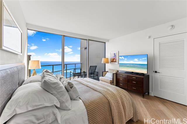 "just minutes from waikiki beach, this elegantly upgraded corner unit offers true resort-style living. enjoy convenient access to a wide variety of nearby restaurants, as well as on-site dining and room-service options available through the hotel. take in sweeping panoramic views of the city skyline framed by the mountains, koko crater and koko head in hawaii kai, diamond head, and the iconic pink palace with waikiki beach as its backdrop. relax on two separate lanais: one off the primary bedroom facing the ocean and the other off the living-dining area with beautiful mountain views. the residence features a well-equipped kitchen, generously sized bathrooms, ample storage—including a walk-in closet in the primary bedroom—and thoughtful details throughout. recent updates include brand-new engineered hardwood floors, adding a gentle sense of warmth and comfort throughout the home. it is a place that truly soothes the heart, reminding you how important the floor can be. new modern roller shades are designed to maximize the stunning 180-degree views unique to this corner unit. experience luxury island living at its finest." -