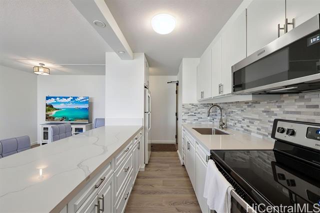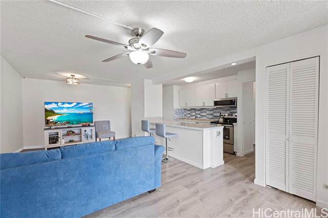 light and bright 1-bedroom in discovery bay's endeavor tower (ewa side). tastefully remodeled, unit 2607 features laminate flooring throughout, updated kitchen counters with a stylish backsplash, and a spacious covered lanai. located on the cool, peaceful mountain side of the building, this unit offers comfortable and convenient island living with quick access to waikiki and metro honolulu. includes a full kitchen with dishwasher, in-unit washer/dryer, and one assigned parking stall. amenities include a pool, spa, sauna, fitness center, recreation/sun deck, bbq area, 24-hour security, and full-service management. maintenance fee covers wi-fi, basic cable, hot water, sewer, and ac chiller. prime west waikiki location near ala moana center, ala moana beach park, dining, shopping, and entertainment. the unit is 96.893% fee simple with the aoao holding both the right and obligation to acquire the remaining 3.107% leasehold interest by december 31, 2039. lease rent is $37.87/quarter or $12.62/month. -