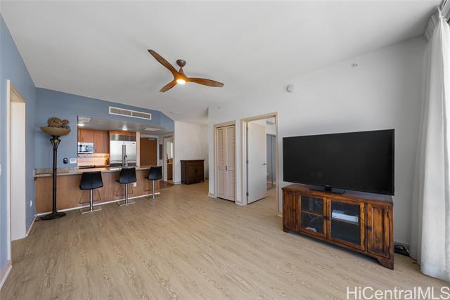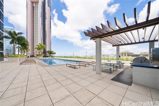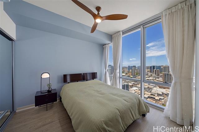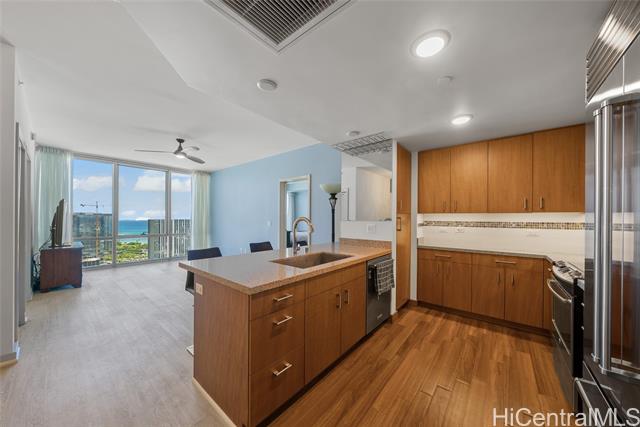 new price! priced below assessed value! experience elevated island living in this stunning high-floor residence in the heart of kakaako. just one floor below the penthouse, this spacious 2-bedroom + den, 2-bath unit offer the best value in the building. enjoy sweeping ocean and city skyline views from the cooler, more private side of the building. with soaring ceilings and abundant natural light, this home exudes a tranquil, airy ambiance. thoughtfully upgraded with high-grade laminate flooring, sub-zero refrigerator, elegant chandelier, closet organizers, ceiling fans, and double curtains. the flexible floor plan features split bedrooms for added privacy and a versatile den-ideal as a dining area, home office, or reading nook. the generous primary suite includes a walk-in closet. enjoy two secured covered parking stalls and access to resort-style amenities: heated saltwater pool, hot tub, gym, playground, bbq areas, and more. this pet-friendly building also offers bike and surfboard storage. conveniently located near downtown honolulu. -