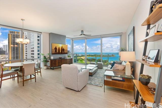 this highly sought-after diamond head–facing ocean corner residence is located on the 15th floor and offers one of the largest 2 bd floor plans in the building, approx. 1,620 sf. this desirable corner stack enjoys sweeping ocean and mountain views with no future construction obstructions, providing exceptional view protection and privacy. the prime location is ideal for enjoying weekly fireworks, the honolulu marathon starting point, parades, and other iconic island events. impeccably maintained and in superb condition, the residence reflects true pride of ownership throughout. over $150,000 in upgrades have been completed, including wood flooring throughout, new appliances, a new ac system, a new hot water tank, ev charger and electric window shades in all living areas except the second bedroom. floor-to-ceiling sliding glass doors seamlessly connect indoor and outdoor living, inviting gentle trade winds and enhancing the open, airy island lifestyle. the unit layout is filled with natural light and offers an elegant yet comfortable living experience. furniture is optional, valued at $85k. this is a rare offering that combines size, views, condition, and long-term value. -