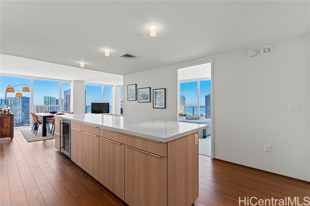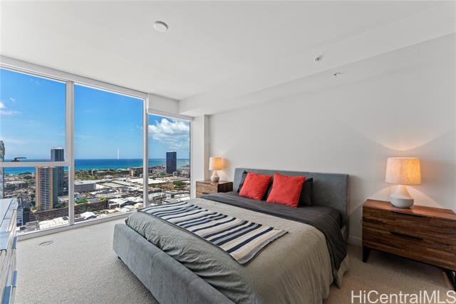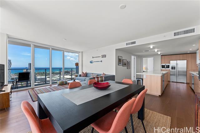 the rarest “05” stack — a designer's dream in the sky! rarely available and always in demand, the high-floor “05” stack is the crown jewel of symphony honolulu, the most coveted southeast corner, offering breathtaking views of the pacific, diamond head, and honolulu's skyline. spanning 1,500+ sq. ft., this corner three-bedroom is a masterclass in modern design and effortless luxury. lightly used and meticulously maintained by its original owner, it's offered fully furnished with curated, high-end pieces for a seamless move-in experience. the studio becker kitchen features bosch appliances, quartz countertops, a built-in wine fridge, and integrated coffee system, blending elegance and performance. the primary suite evokes a private retreat with custom millwork, spa-inspired shower, and walk-in closet. a full laundry room completes this highly functional layout. enjoy resort-style amenities: heated infinity pool, cabanas, bbq stations, fitness and yoga studios, theater, spa room, guest suites, and dog park: all within one of honolulu's most striking, pet-friendly towers. a rare fusion of design, technology, and tranquility — the “05” stack is modern living at its finest. -