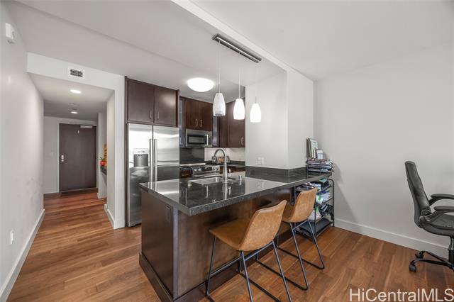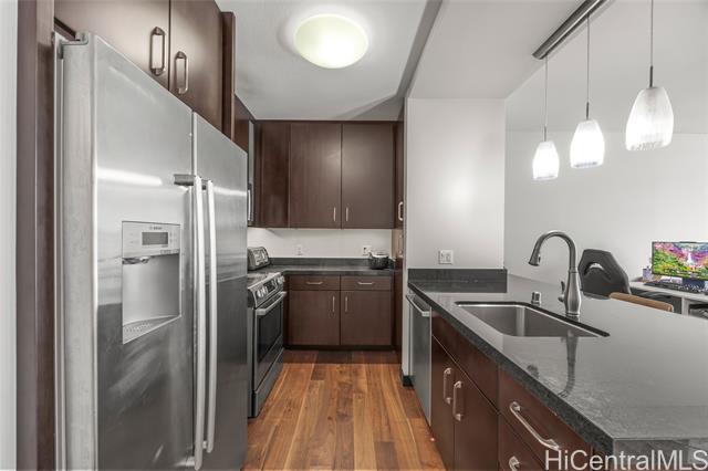 experience the pinnacle of urban living in this rarely available high-floor residence at waihonua. perched on the 40th floor, this sleek 1-bedroom, 1-bathroom home offers breathtaking, unobstructed vistas of the honolulu skyline and the majestic ko‘olau mountains. the interior reflects modern elegance with floor-to-ceiling windows, rich hardwood flooring, and a gourmet kitchen featuring polished granite countertops and premium bosch stainless steel appliances. unlike many urban units, this residence offers the ultimate convenience: one dedicated parking stall and a private storage locker. resort-style amenities living at waihonua means access to a private club-style environment. the 6th-floor recreation deck is your personal playground, featuring. -