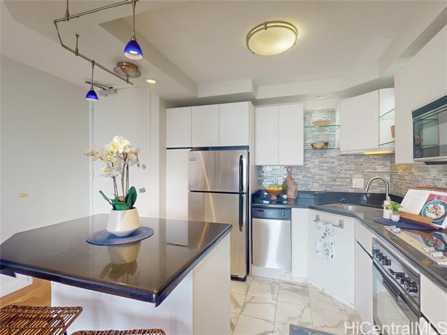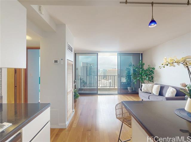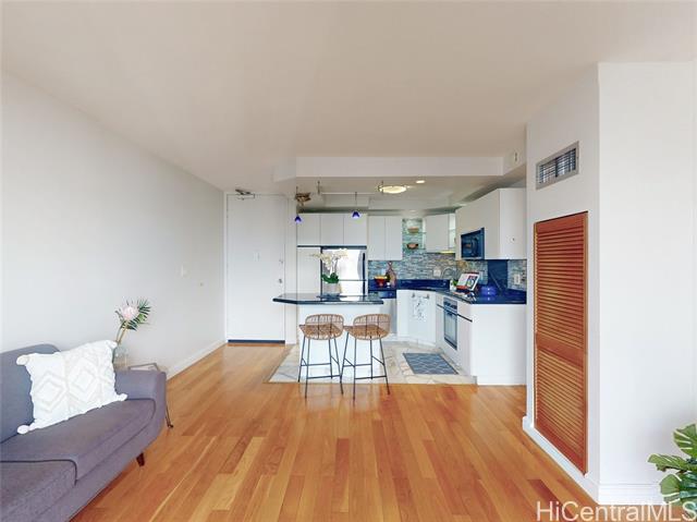 this upper-floor 2-bedroom, 1-bath residence at chateau wakiki offers wide-ranging views from the valley of the ocean, including ala moana beach park, the ala wai canal, and the hawaii convention center, with beautiful waikiki sunsets enjoyed from the large open lanai. the modern interior features hardwood floors, electric blinds, pendant lighting, stainless steel appliances, and a bathroom finished with floor-to ceiling tile, along with the convenience of an in-unit washer and dryer. a valuable highlight is two well-located parking stalls-one on the ground level and one on the second floor-an uncommon and highly desirable feature in waikiki. chateau waikiki is a well-maintained building on the sought-after west side of waikiki, offering amenities such as a pool, gym, bbq entertaining deck, recreation room, and library. the location allows easy access in and out of waikiki, quick connections to kalakaua avenue and ala moana boulevard, and is just a few blocks from kahanamoku beach park, the ala wai boat harbor, nearby shops, restaurants, and entertainment. make an appointment and come see today! disclaimer: one or more images have been virtually enhanced. -