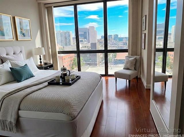 price adjustment! enjoy executive living in this beautifully remodeled 2-bedroom, 2-bath residence at harbor square town tower, featuring a spacious 121 sq. ft. lanai with ocean views. this upgraded suite includes bella pietra travertine tile in the living area, pergo wood flooring in both bedrooms, and custom absolute stone tile work in bathrooms and asbestos-free ceilings. the primary bath showcases sapele wood vanity with granite countertop and a custom-built sapele bedroom closet system. the functional kitchen offers radianz countertops, sapele wood cabinetry, sub-zero refrigeration, custom lighting, and upgraded appliances. enjoy sweeping vistas of the ward village skyline, punchbowl, iolani palace, and city lights. located in the heart of downtown honolulu's revitalization, you're minutes from retail, grocery options, restaurants, banks, hospitals, hpu, aloha tower, and more perfect for those who want to work and play in the center of it all. -