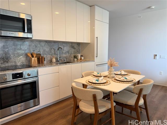 located in ward village, this one-bedroom aalii unit is located on the diamond head side of the building and provides a sunny view of the ocean from your own private lanai. bosch appliances grace the kitchen with whirlpool washer and dryer close at hand. split air conditioners in the bedroom and living area keep the unit cool and a fresh coat of paint throughout makes this unit just like new! there is one secured parking with overhead storage and a 24/7 front desk to assist you. there are two amenities decks with something for just about everyone! the penthouse level on the 42nd floor includes a 360-degree view of the surrounding ocean and mountains, comfortable indoor and outdoor workspaces, meeting rooms, and a fully equipped gym. the eighth floor pool and jacuzzi are surrounded by barbeque areas, cabanas, a playground, keiki pool and party rooms with fully equipped kitchens. a dog washing station and play area are located on the ground floor. this unit is steps from theatres, award winning restaurants, shopping, groceries, urgent care, and ocean recreation. it does not get much better! -