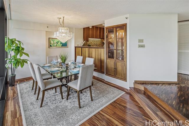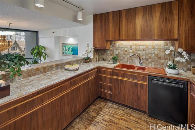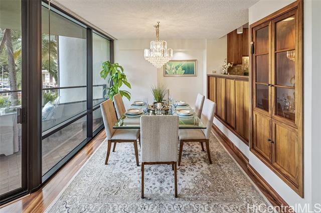 experience refined island living in this beautifully appointed 2-bedroom, 2-bath residence on the preferred side of the building, overlooking the lagoon-style pool, spa, and lush tropical gardens from an abundance of windows. this unit, originally the model, showcases renowned exotic koa wood cabinetry throughout the kitchen, dining, and living areas, creating a sophisticated ambiance unique to hawai‘i. a modern entryway and hallway with art niches set the tone for this home. the open layout flows seamlessly to a private covered lanai—perfect for morning coffee or sunset relaxation amid serene garden and pool views. the primary suite offers a true retreat, complete with an en-suite bathroom, walk-in closet, and an additional lounging space ideal for reading or relaxing. the second bedroom with views of greenery doubles nicely as a guest room or home office. there is a wine cellar/meeting room complete with your own cave and table for wine tasting. the home includes central ac, two tandem parking stalls and private storage in the gated garage. the grounds, lobby, and elevators are impeccably maintained. located close to punahou school, university of hawaii, and easy freeway access. -
