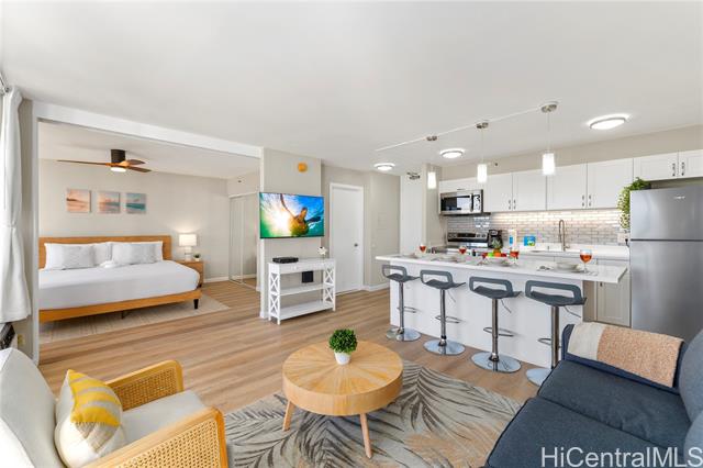 experience breathtaking views of waikiki's iconic diamond head from this beautifully upgraded 1-bedroom, 1-bath condo-hotel, complete with turn-key, rental-ready convenience and with 1 parking space! perched on a desirable high floor in tower 1, this unit showcases stunning coastline, ocean, city lights, and mountain vistas. the open floor plan and spacious lanai create an inviting space for relaxation and enjoyment of the scenery. legal short-term and daily vacation rentals are permitted, making this an ideal investment opportunity. waikiki banyan stands out as the ultimate vacation condo-hotel, ideal for traveling families and pet-friendly enthusiasts alike. this exceptional building is not only well-managed and maintained, but it is also financially sound—making it a highly sought-after investment opportunity in waikiki. enjoy resort-style amenities including a refreshing pool, hot tubs, a children's play area, and a convenient on-site cafe. located just moments away from the sandy beaches, kapiolani park, and iconic diamond head, everything you need right at your doorstep in the world-famous resort destination of waikiki. the monthly maintenance fee $998 covers all utilities. -