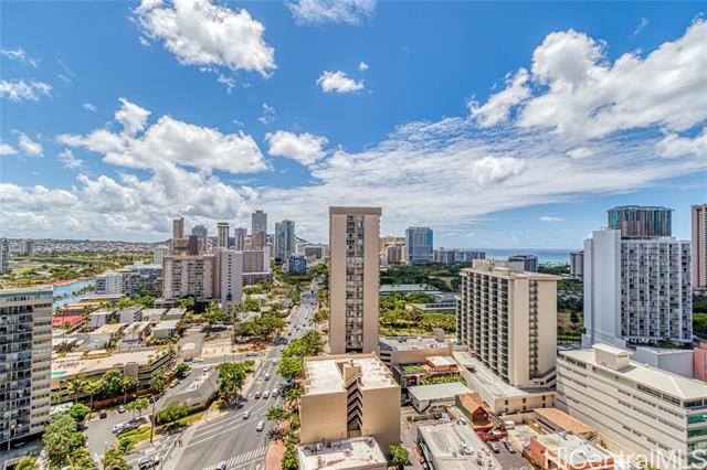 rare 2-bed, 2-bath, highly desired corner unit—one of the largest layouts—offering bright, airy living w/extra windows for your added comfort! upgraded w/newer kitchen appliances, hardwood floors, carpet, custom window shades & water heater. expansive lanai w/stunning ocean, waikiki & mountain views. prime waikiki location near ala moana, beaches, dining & bus lines. resort-style amenities: pool, jacuzzi, fitness, bbq, rec room, bike/surf racks, dog park, garden, lobby fire pit, 24-hr concierge, guest parking & pet-friendly living. -