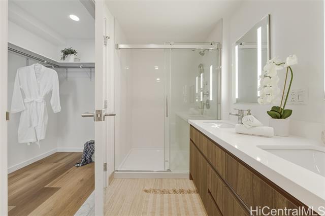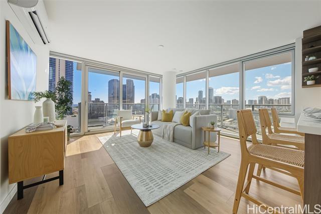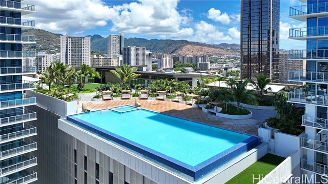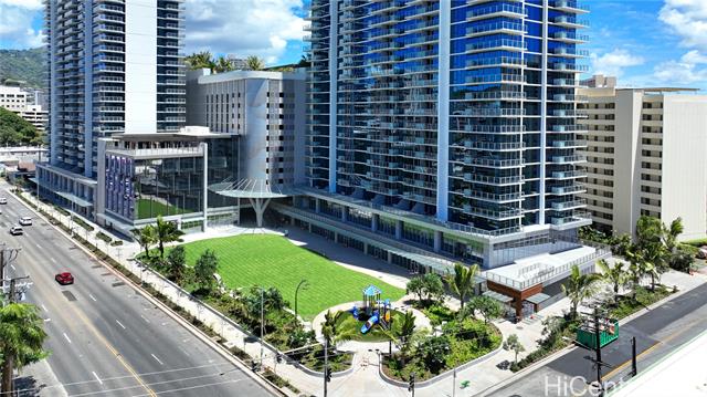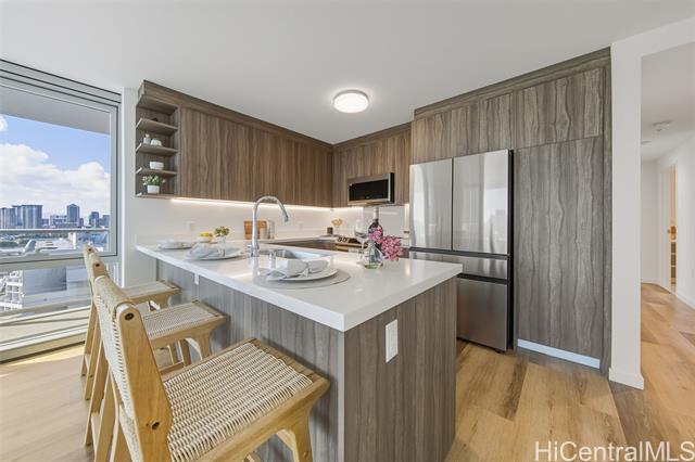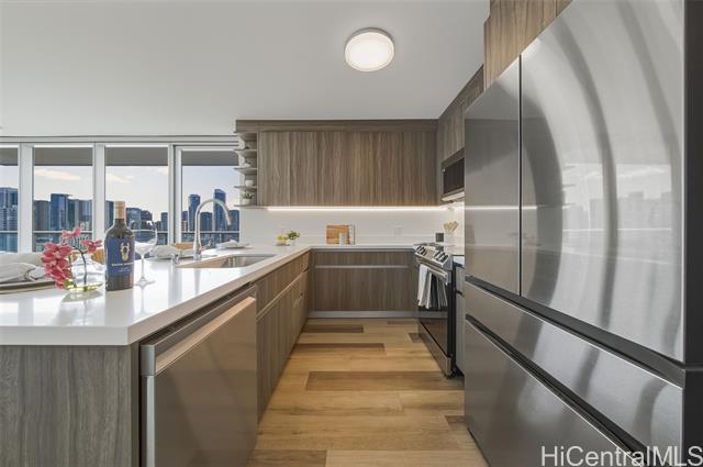brand-new, never-lived-in 2-bedroom, 2-bath corner unit with a wraparound lanai offering 180-degree views of the city, mountains, and ocean. features luxury vinyl plank flooring throughout (no carpet), an open kitchen with a large counter-bar, soft-close cabinets, stainless steel appliances, quartz counter tops, and more. split a/c in every room, a primary bedroom with a walk-in closet, a primary bathroom with a walk-in shower, and a dedicated laundry room. includes two side-by-side parking stalls on level 4, conveniently located near the building entrance. enjoy resort-style amenities with an infinity pool and whirlpool overlooking the city skyline, private bbq pavilions, movie theater, indoor fitness center, yoga studio, sauna room, playground, dog park, and an elegant clubroom for private gatherings. conveniently and centrally located, ideally situated in a walkable neighborhood with premier shopping, dining, and entertainment at nearby ala moana center. on-site retail and a new international food court are coming to the building, adding even more convenience.   ***  first public open house on 11/02/25(sunday) 2 pm-5 pm*** -