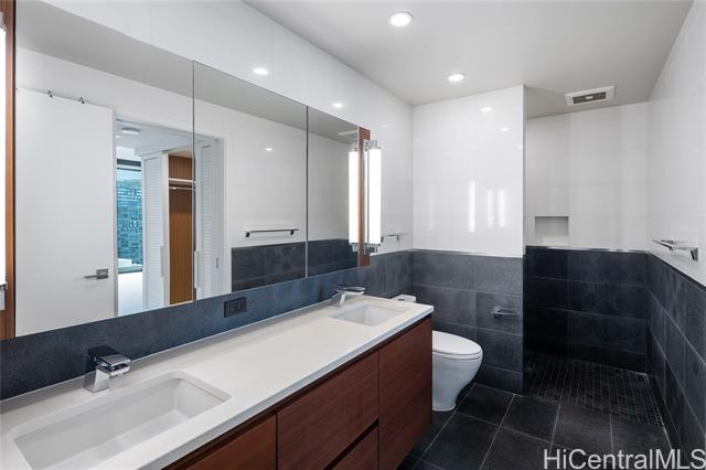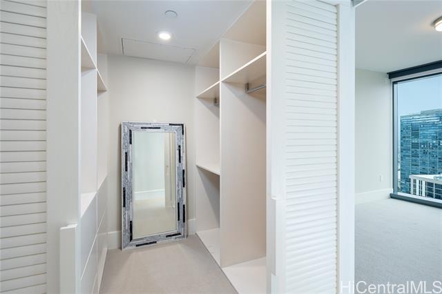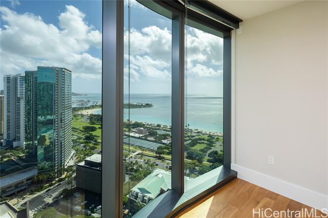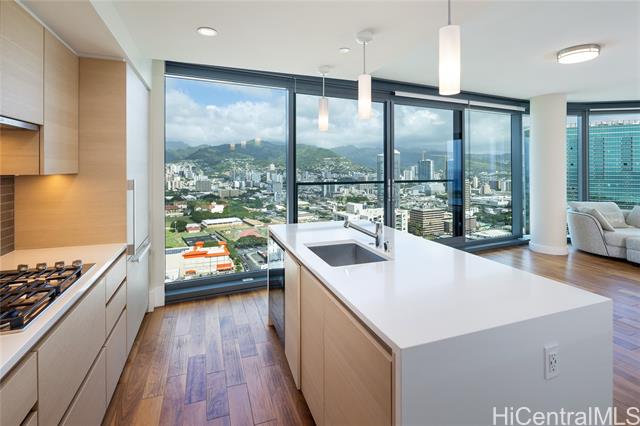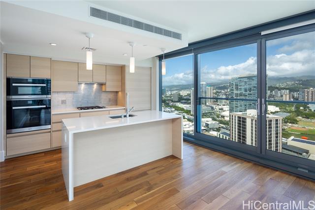 fall in love with this luxurious, much preferred, corner unit boasting panoramic views of the beach, ocean and mountains. floor-to-ceiling glass wraps around the living area, offering breathtaking vistas and inviting cool breezes. high ceilings and wide sliding doors create a bright and airy atmosphere. the gourmet kitchen features top-of-the-line miele appliances, including a gas stovetop and a wine refrigerator, perfect for the discerning chef. high-quality finishes abound, with quartz countertops, hardwood floors, newer carpet in the bedroom and recently painted throughout. this private corner unit offers ample storage, including a walk-in closet. unwind in the world-class amenities, including a stunning cantilevered glass bottom pool, a hot tub, a private theater, a tennis court, a fitness center, multiple entertainment areas with chef's kitchens and much more. beyond the building, enjoy the vibrant ward village community with its shops, restaurants, and being right next door to whole foods market. ala moana beach park is across the street, offering endless opportunities for outdoor activities. a must see for anyone looking to purchase a luxury one-bedroom in ward village. -