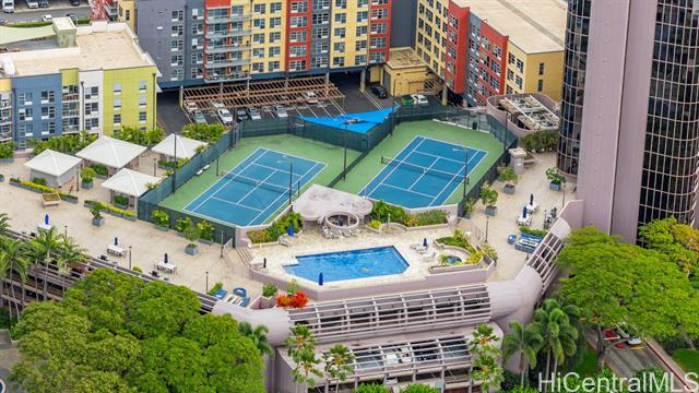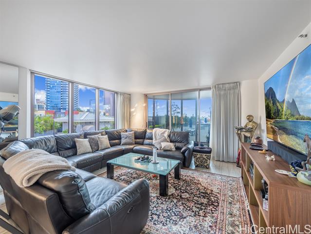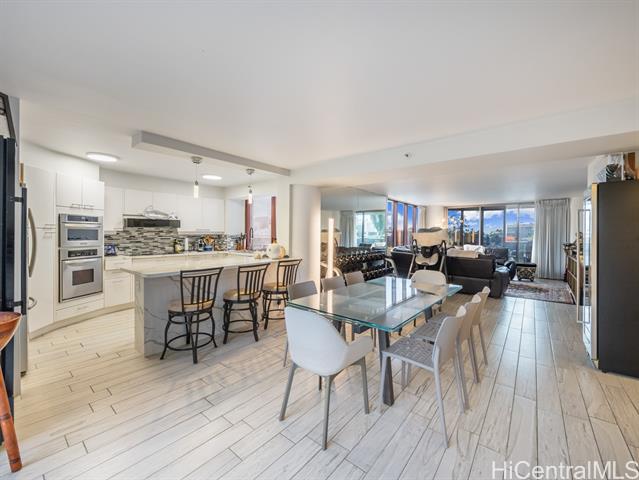 experience the best of urban island living in this spacious 2-bedroom, 2-bath, 2-parking unit located in the heart of kaka'ako- hawaii's most dynamic and vibrant neighborhood. this low-floor corner unit features a generous lanai with tranquil tree-top and ocean views, perfect for relaxing or entertaining. inside, the unit boasts a sleek, glossy ceiling and large living room mirrors that enhance light and space with wall to wall porcelain plank tile flooring. the recently renovated kitchen is both modern and functional, showcasing wide quartz countertops and island, ample cabinetry and drawers, newer appliances, and a built-in bar. comfort is ensured with a rebuilt a/c system and new thermostat. the primary suite includes walk-in closet and an ensuite bathroom with updated shower tile. floor-to-ceiling windows and sliding doors complete with new drapes and blinds fill the living and dining areas with natural light, creating a bright, townhouse-like atmosphere with the security and convenience of condo living. enjoy access to impressive amenities including two fire pits, party cabanas, and more. ideally situated near salt, downtown, aloha tower, hospitals, beaches, & restaurants. -