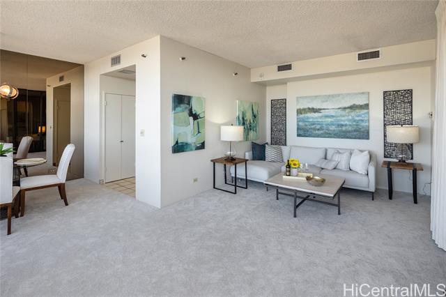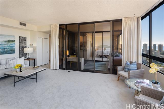 now is your chance to own this one-of-a-kind, ph unit in iolani court plaza! this unique and spacious 38th floor, 1081sf 1bedroom/1 bath unit comes with two full-size, side-by-side parking stalls. the ph floors have high 9' ceilings, and a gorgeous glass line spans the entire length of this unit to offer beautiful mountain-to-ocean views. a 163sf enclosed glass den can be used as a second bedroom, office or craft studio - or, perhaps open up the space to enlarge the entire unit. upgrades include brand new carpet, new stainless steel kitchen appliances, and fresh paint throughout. central ac keeps the unit nice and cool, and electricity is included with the fee. the building has sprinklers to comply with fire safety regulations. iolani court plaza features a variety of amenities - pool, jacuzzi, bbq grills, recreation room, grassy lounge area, tennis courts, pickleball court and a putting green. the building is conveniently located near restaurants and shopping at moiliili, mccully and uh manoa. it is also near the freeway on and off ramps, and by iolani school. -