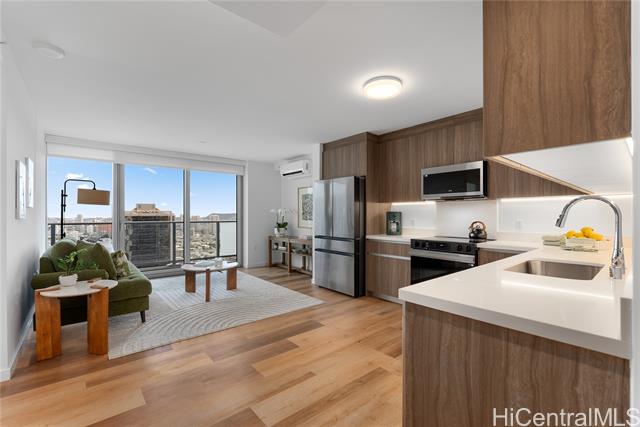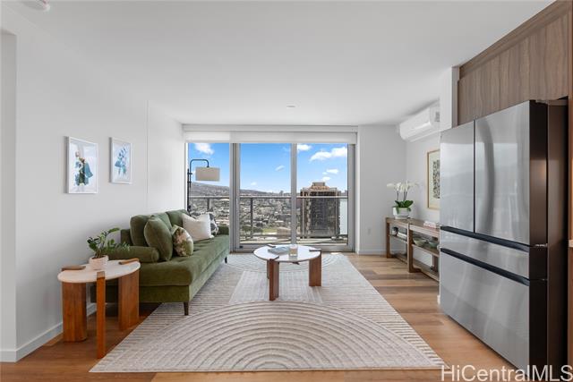 "the park on ke'eaumoku is completed & resales present an excellent opportunity to buy new without the wait! located in the liona tower, this preferred larger 1-bedroom, ""07""unit is move-in ready, including furniture, auto window shades, hardwood floors! ideal high-floor unit on the cooler east facing side, with unobstructed, sweeping mountain, diamond head, & waikiki views. enjoy colorful rainbows on misty mornings as the sun rises, & expansive city lights in the evenings. wonderful, east facing breezes filter through the unit for those who prefer a fresh atmosphere of hawaii's clean air! the park on ke'aumoku is centrally located in urban honolulu, within minutes to a wide variety of restaurants, ala moana shopping center, ala moana beach park, nightlife & honolulu's lively urban scene. these resort style amenities make this price a bargain: infinity pool, cabanas, whirlpool spa, bbq pavilions, club room, fitness, yoga studio, sauna, co-work spaces, media lounge & private movie theater. as building costs continues to rise, honolulu's newest residential landmark condominium, offers the perfect first time home, investment or vacation retreat!" -