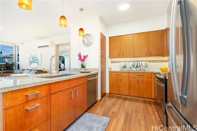 rarely available 2 bedroom, 2 bathroom, 2 parking home at keauhou place located on the rec deck. utilize the amazing amenities as if it was your backyard fitness center, a large pool for lap swimming, playground, bbq and a party room. two prime oversized side-by-side parking stalls stalls on the 3rd floor located close to the elevator. the residence boasts a range of desirable features including quartz countertops, stainless steel appliances, vinyl plank and ceramic tile flooring as well as soft-close cabinets. the unit has been freshly painted with blinds, blackout drapes for privacy, newer carpet, newer refrigerator, built in entertainment center, and numerous built in storage spacious cleverly added. right outside the lobby door you'll find down to earth, while hmart, salt, and various restaurants are just a short stroll away. enjoy all the conveniences of living right in the heart of kakaako. -