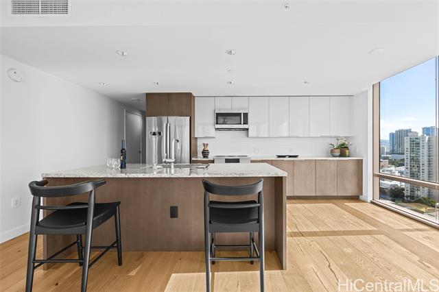 "ae'o, one of honolulu's iconic high-rise condo buildings, offers exceptional amenities and a sophisticated urban lifestyle. directly connected to hawaii's flagship whole foods market, ideally located in the heart of ward village, honolulu's premier master-planned urban community in the kaka'ako district, emphasizing sustainable living practices. a diverse selection of acclaimed restaurants, cafes, farmer's market, yoga, pilate studios, boutique shops, and theaters are just steps away. this premium 00 unit, southeast facing with morning sun, is located on the 19th floor and features 3 bedrooms & 3 bathrooms, including two en-suite suites with walk-in closets & deep soaking tubs. the 19th-floor elevation provides better vantage points with sweeping views of the pacific ocean, ala moana beach park, and kewalo basin harbor. newly refreshed and thoughtfully designed with floor-to-ceiling windows, the residence provides abundant natural light and an open, airy feel. high-quality european fixtures and finishes offer both refined style and everyday practicality. two side-by-side parking stalls are ideally located on the mezzanine level, providing convenience and easy access." -