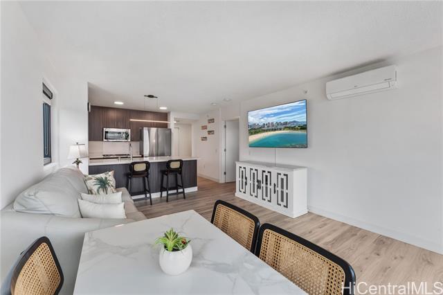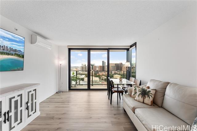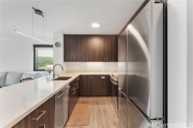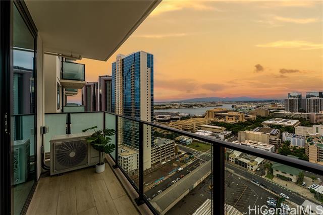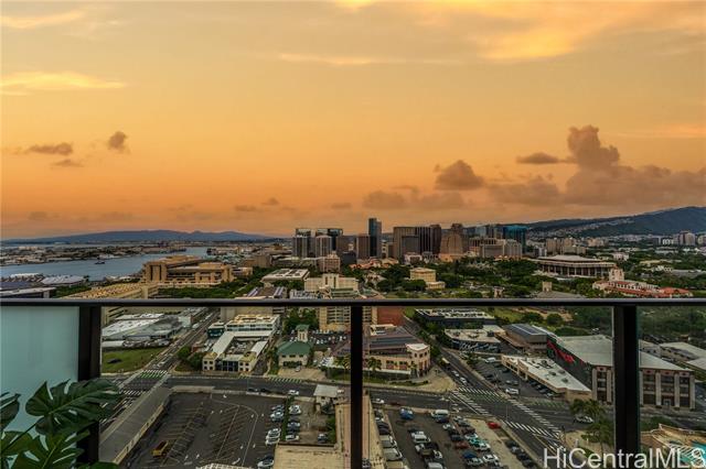 beautiful sunset view , newly renovated 2-bedroom, 2-bath corner unit with 2 covered tandem parking stalls, located in the heart of kaka'ako. this newly completed 2024 residence features professional new lvp flooring throughout, tile flooring on the patio, glass shower doors, and plantation windows with blinds, creating a clean, modern aesthetic. enjoy sweeping views of downtown honolulu, the lush mountain backdrop, and the iconic aloha tower from this well-positioned corner unit. the building offers an impressive array of resort-style amenities, including a multipurpose room, splash pool, bbq areas, community garden, putting green, outdoor cinema, bicycle and surfboard workshop, and a beautifully designed co-working space. -