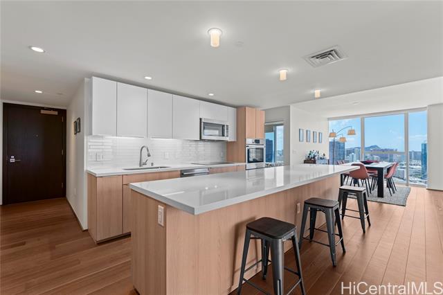 the rarest “05” stack — a designer's dream in the sky! rarely available and always in demand, the high-floor “05” stack is the crown jewel of symphony honolulu, the most coveted southeast corner, offering breathtaking views of the pacific, diamond head, and honolulu's skyline. spanning 1,500+ sq. ft., this corner three-bedroom is a masterclass in modern design and effortless luxury. lightly used and meticulously maintained by its original owner, it's offered fully furnished with curated, high-end pieces for a seamless move-in experience. the studio becker kitchen features bosch appliances, quartz countertops, a built-in wine fridge, and integrated coffee system, blending elegance and performance. the primary suite evokes a private retreat with custom millwork, spa-inspired shower, and walk-in closet. a full laundry room completes this highly functional layout. enjoy resort-style amenities: heated infinity pool, cabanas, bbq stations, fitness and yoga studios, theater, spa room, guest suites, and dog park: all within one of honolulu's most striking, pet-friendly towers. a rare fusion of design, technology, and tranquility — the “05” stack is modern living at its finest. -