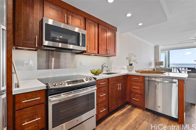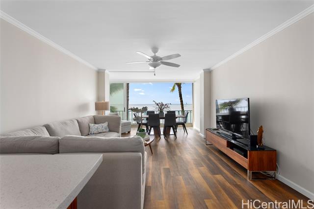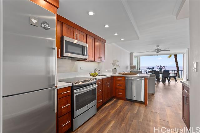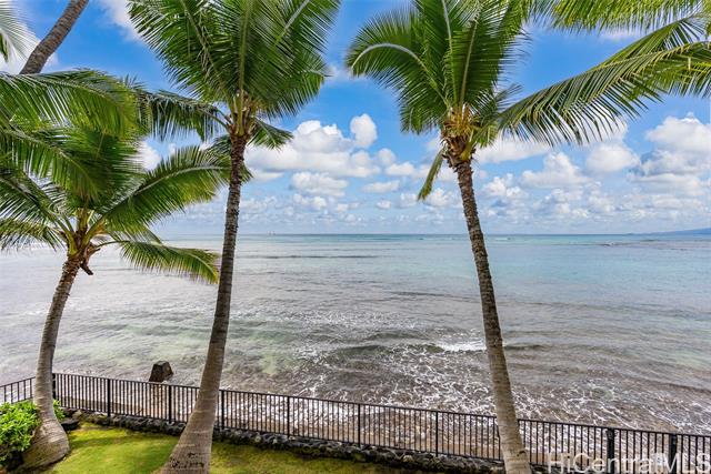 "this oceanfront condo on o'ahu's gold coast offers an unparalleled living experience, combining modern luxury with natural beauty. the sound of the waves, the stunning ocean and sunset views make for an an incredibly peaceful and rejuvenating experience. this completely and tastefully remodeled unit boasts new cabinets and quartz countertops, luxury vinyl floors, automatic blinds, new appliances, in-unit washer and dryer, smooth ceilings (no popcorn), crown molding. fully furnished and situated in a secure building, this condo provides direct ocean access. enjoy the convenience of kapiolani park nearby, along with world-class shopping, boutiques, and fine dining just minutes away. this waterfront jewel promises a perfect blend of comfort and elegance in a prime location. coop taxes are included in the maintenance fee." -