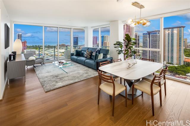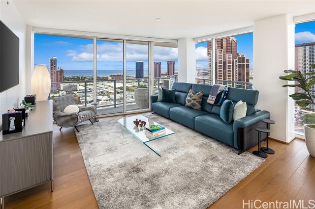 high-floor 3-bedroom condo in kakaako with ocean, city and mountain views. this unit is move in ready and thoughtfully laid out for everyday living. from the moment you enter, the unit offers ocean views and with floor to ceiling windows that bring in steady, natural light, all throughout the day. the floor plan is practical and livable, featuring a separate laundry room, an open kitchen with a large island, and a living area that comfortably accommodates both relaxing and entertaining. the lanai seats 2+ and the sunsets from here are incredible. the kitchen features studio becker cabinetry, soft-close drawers, bosch stainless steel appliances and a quartz countertop for the island. a great gathering place in this home is indeed the kitchen. engineered hardwood flooring runs throughout the main living area and has been well maintained. each room is equipped with motorized shades for heat and light control. the primary suite is spacious with incredible ocean views, walk in closet and a dual vanity. the unit comes with 2 side by side parking stalls. pets are allowed. building is centrally located to all the conveniences of a modern city like honolulu is. come see today! -