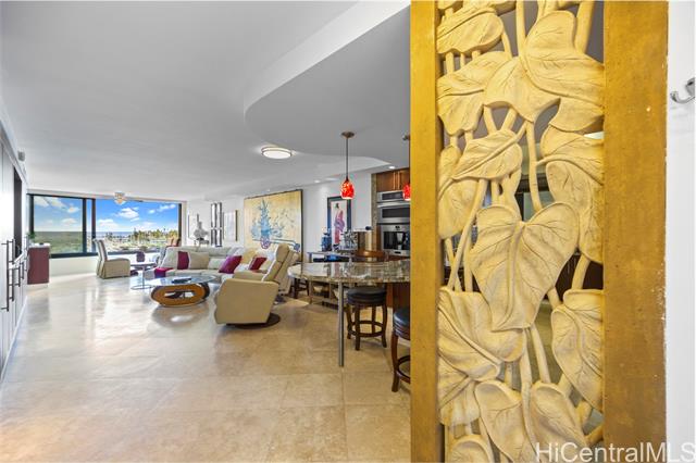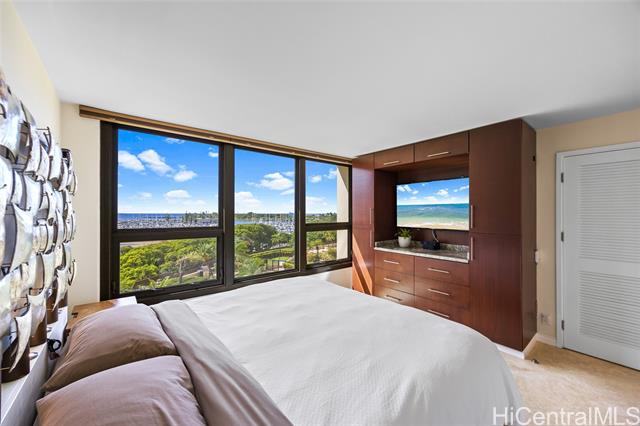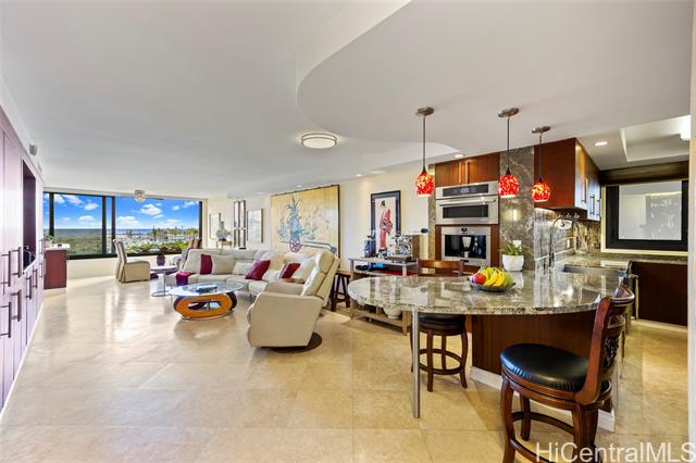 enjoy ocean, marina, and sunset views from this stunning and sophisticated apartment home. one of the larger one-bedroom floor plans in the building, the unit offers a bright open living area designed to maximize light and views. thoughtfully and luxuriously renovated with quality materials and custom built-ins, the residence features travertine floors, warm wood cabinetry, and a fully equipped kitchen seamlessly integrated into the living space. the bedroom offers generous storage and is a peaceful retreat with large windows framing lush greenery and city views. located at the gateway to waikiki, just moments from ala moana shopping center, beach, and park, this well-maintained residence provides a comfortable and convenient island lifestyle. in the quiet diamond head tower of the complex, the apartment offers easy access to an array of amenities including swimming pool, whirlpool spa, barbeque/recreation area, and tennis court. an assigned and secure parking stall is close to the lobby entrance. elegant furnishings are available. -