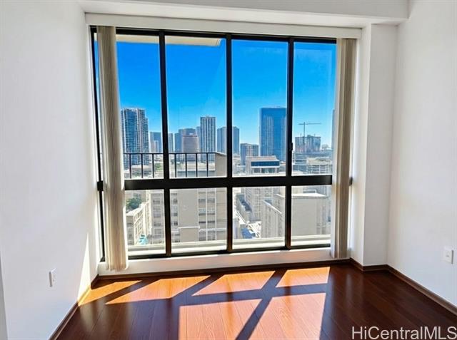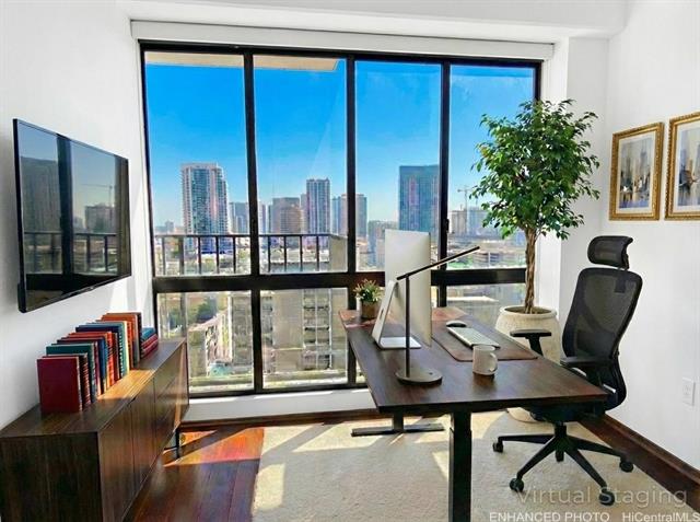 enjoy executive living in this beautifully remodeled 2-bedroom, 2-bath residence at harbor square town tower, featuring a spacious 121 sq. ft. lanai with ocean views. this upgraded suite includes bella pietra travertine tile in the living area, pergo wood flooring in both bedrooms, and custom absolute stone tile work in bathrooms and asbestos-free ceilings. the primary bath showcases sapele wood vanity with granite countertop and a custom-built sapele bedroom closet system. the functional kitchen offers radianz countertops, sapele wood cabinetry, sub-zero refrigeration, custom lighting, and upgraded appliances. enjoy sweeping vistas of the ward village skyline, punchbowl, iolani palace, and city lights. located in the heart of downtown honolulu's revitalization, you're minutes from retail, grocery options, restaurants, banks, hospitals, hpu, aloha tower, and more perfect for those who want to work and play in the center of it all. -