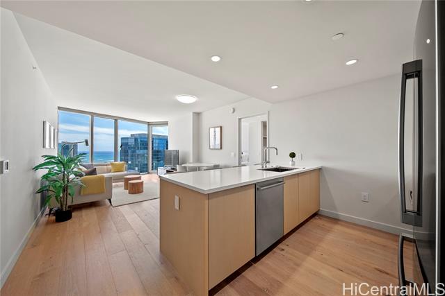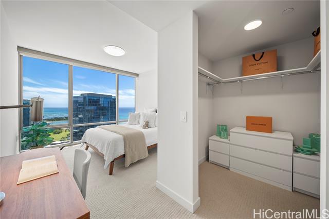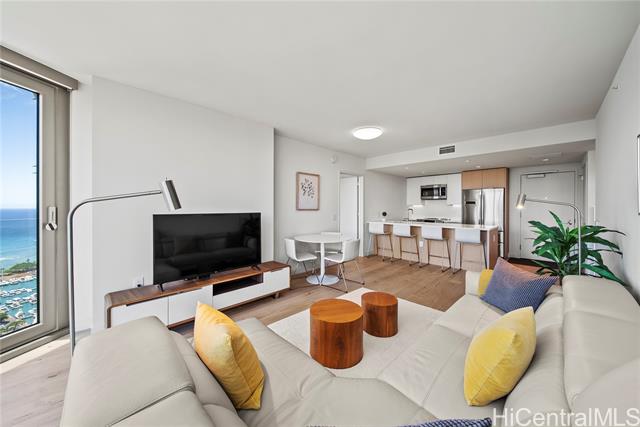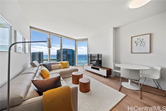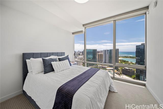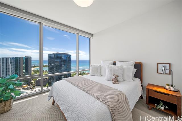 "a preferred high-floor 2-bedroom 2-bathroom diamond head side residence with 2-separate non-tandem parking stalls, one w/a electric vehicle (ev) charger and a deeded storage unit just steps away! outstanding coastline, ocean and city views over both ala moana beach park & the future ka lai park w/a unique large operable ""bump-out"" living room window that is perfectly angled to take advantage of these beautiful views. desirable split-bedroom floor-plan and motorized sunshades throughout for added privacy. ""light and bright"" engineered wood flooring, designer studio becker cabinetry, quartzite counter and vanity tops, all stainless bosch appliances, as well as toto wash-lets and double vanity sinks in both bathrooms. in ""move-in"" condition! amenities include a large fitness center, separate heated lap & wading pools, whirlpool, sauna, steam-room, bbq cabanas, party/media rooms & guest suites. private access to the largest whole foods in hawaii! ae'o is ideally located in the highly coveted neighborhood of ward village, in kaka'ako. a multitude of restaurants and a wide variety of shopping options at the nearby south shore market and the world-class ala moana shopping center." -