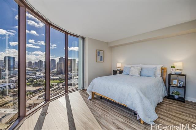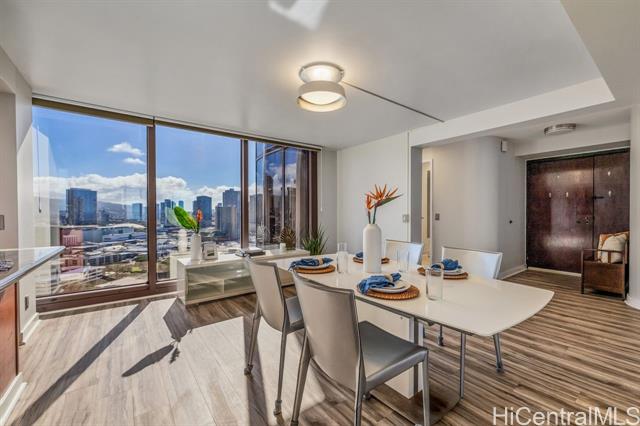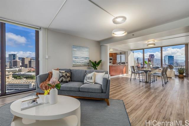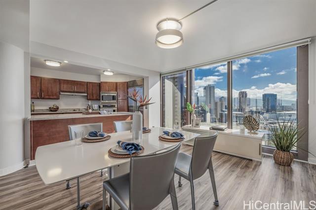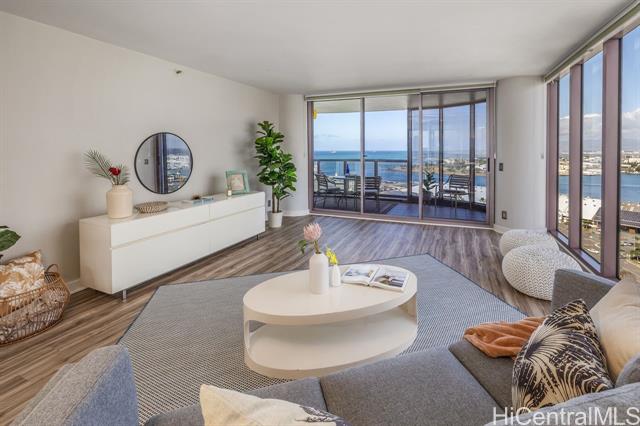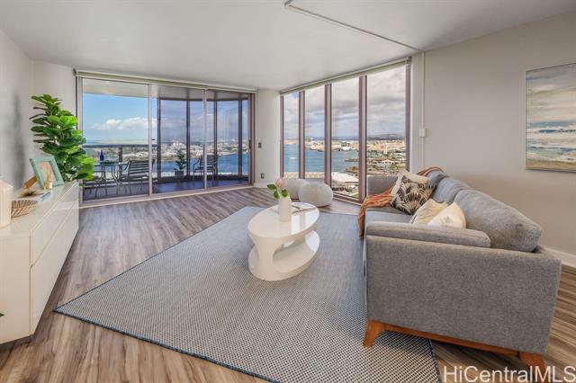 like living in a treehouse in the heart of vibrant kaka'ako, this residence captures breathtaking views from mauka to makai. enjoy sweeping panoramas of the harbor, coastline, and spectacular sunsets, with ships gliding in and out of the harbor, honolulu's downtown skyline rising nearby, and the mountains providing a stunning backdrop. located in the highly desirable makai tower, this home offers generous living spaces and expansive views from nearly every room, creating a bright and open atmosphere that truly connects you to the surrounding landscape. the beautifully designed recreation deck features an impressive array of amenities, including a heated pool, bbq cabanas, outdoor lounge areas with gas fire pits, indoor and outdoor fitness spaces, tennis and pickleball courts, and a relaxing sauna. ideally situated in kaka'ako near salt at our kaka'ako and restaurant row, you'll be surrounded by some of honolulu's best dining, shopping, and entertainment. this pet-friendly building provides two covered parking stalls, abundant guest parking, and 24/7 security. recent improvements include updates to the building's amenity deck, plumbing, and roof, offering added peace of mind. -