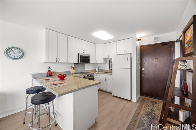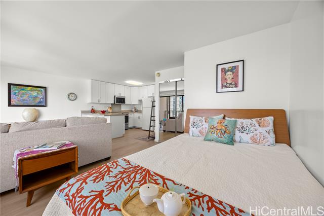 rarely available studio at the four paddle features a remodeled kitchen with quartz countertops and shaker-style cabinets, newer stainless steel range and microwave hood, a smooth ceiling, newer tile floors in the bathroom and laminate flooring in living room, and step-in shower. relax on your lanai with a partial ocean view and stay cool with central ac. entertain guests poolside while they enjoy the jacuzzi, bbq area, and sauna. pet-friendly building and minutes to world class shopping, dining and entertainment. building has full replacement coverage and maintenance fee includes electricity, gas, cable, and internet service. -