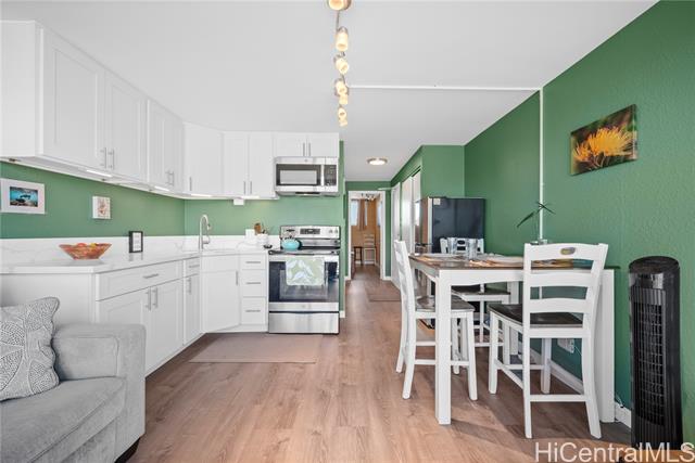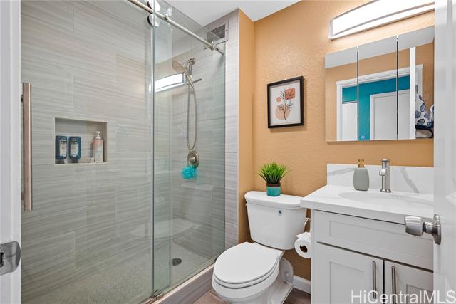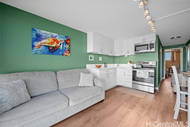 "nearly $100,000 in upgrades to this move-in ready unit! there are upgraded picturesque living room windows at a cost of $17,942.89 done in january 2021. this window system replaced the 49-year-old, single-paned window that most units still have. the new window system utilizes modern, dual-pane, low e, 1"" insulated glass which is substantially quieter and reflects much more of the sun's heat (infrared radiation) and damaging rays (ultra violet radiation). the class i clear anodized aluminum extrusions are also much thicker for increased wind load capacity meeting modern requirements. the bedroom window was also recently replaced with a double paned slider. also in 2021, a full unit renovation was done, including removal of the popcorn ceiling, luxury vinyl plank flooring added, and interior painting. kitchen design is unique, with the sink in the rounded corner, soft close cabinets and quartz counter tops. shower has a cute sliding barn door. all furniture is included (purchased from ashley honolulu), including a sofa that can be converted into a queen size bed. for the past 5 yrs, this unit has been used as a second vacation home so it's hardly been used and in excellent condition." -